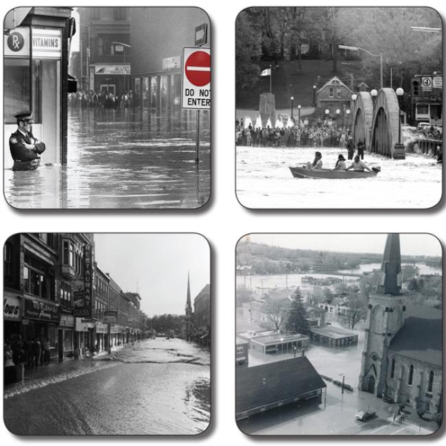 Coaster Set # 1 featuring downtown Cambridge, ON, during the Flood of 1974
